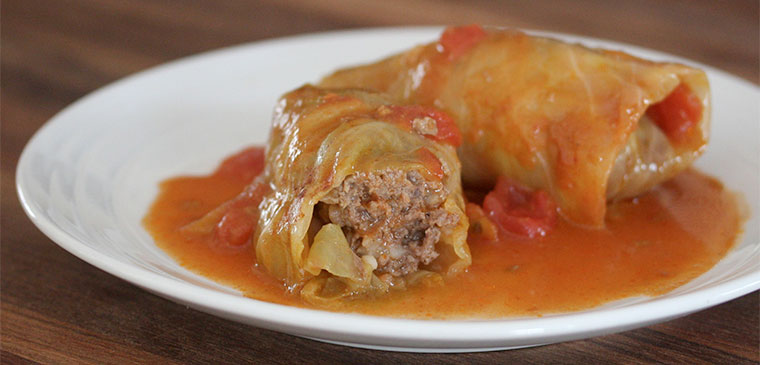Roll into drained cabbage leaves (amount depends on size of leaf) tuck in corners and layer in kettle, tuck-side down with sauerkraut.