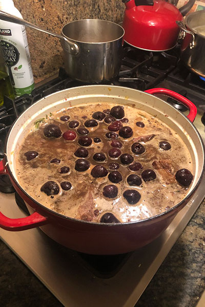 5. Remove the ribs to a serving platter. Skim fat from the cherry sauce, and strain all the cherries, vegetables, and juices through a fine-mesh sieve into a bowl. Discard the solids, and return the liquid back to the pot. Bring to a boil, and cook the sauce over medium heat until thickened, about 10 minutes, stirring frequently; whisk in butter. Serve sauce over the short ribs.