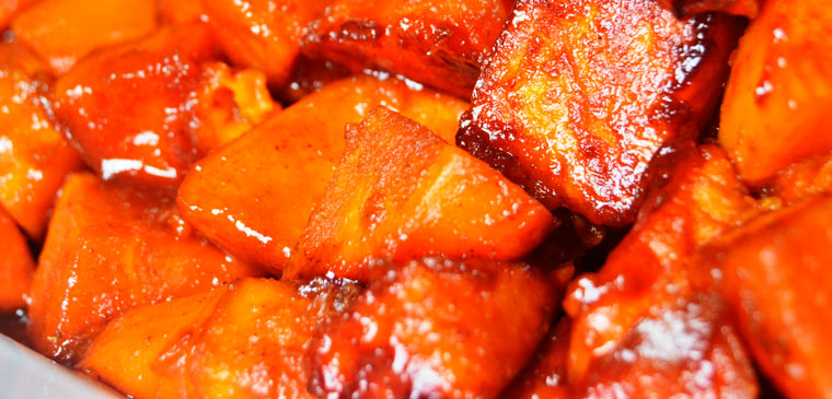 Slice & place in a casserole dish (sprayed with cooking spray). Set aside.