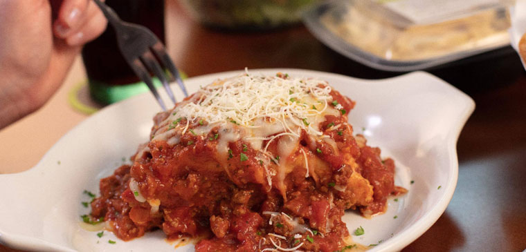 Bake the covered Olive Garden lasagna for 20 minutes, then remove the foil and bake for another 10 minutes to get a golden, crispy, melting top layer.